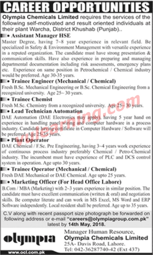 Olympia chemical limited needs the services of self motivated & energetic individuals in its warcha plant ( khushab)