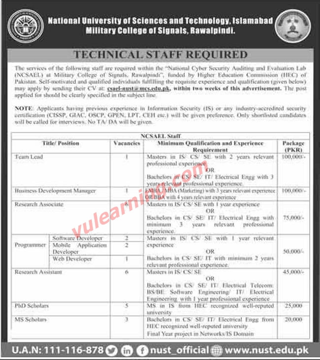 Advertisement of NUST EME College Rawalpindi Jobs for Electrical Engineers.