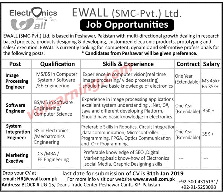 Ewall (SMC-Pvt.) Ltd Peshawar need services of Electrical Engineer for post of Image Processing Engineer